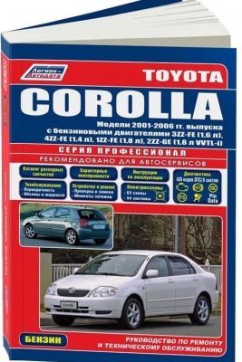 Пособие справочное Книга по ремонту Тойота Королла, а также руководство по эксплуатации и техническому обслуживанию, устройство автомобиля Toyota Corolla с 2001 по 2006 г. выпуска, оборудованных бензиновыми 3ZZ-FE (1,6 л), 4ZZ-FE (1,4 л), 1ZZ-FE (1,8 л), 2ZZ-GE (1,8 л WTL-i) двигателями. Ремонт Тойота Королла. Каталог расходных запчастей. Инструкция по эксплуатации и техобслуживанию. Описание неисправностей. Диагностика. Устройство автомобиля. Схемы электрических соединений.