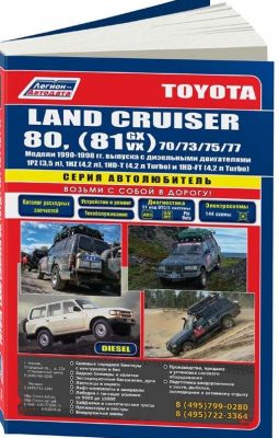 Пособие по ремонту Тойота Ленд Крузер 80, книга по эксплуатации, руководство по техническому обслуживанию автомобилей Toyota Land Cruiser 80, (81 GX / VX), а также серий 70 / 73 / 75 / 77 1990-1998 гг. выпуска, с левосторонним и правосторонним рулевым управлением, оборудованных дизельными двигателями 1PZ (3,5 л.), 1HZ (4,2 л.), 1HD-T (4,2 л. с турбонаддувом) и 1HD-FT (4,2 л. с турбонаддувом, 24 клапана).  Ремонт Тойота Ленд Крузер 80. Каталог расходных запчастей. Устройство Тойота Лендкрузер 80. Рекомендации по техобслуживанию. Диагностика. Схемы электрических соединений.