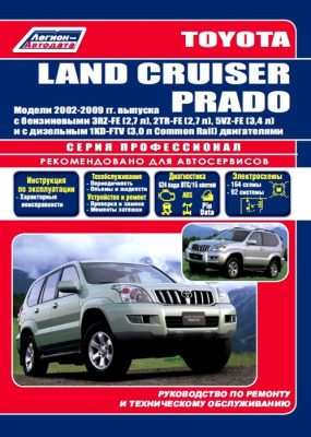 Подробнейшее руководство по ремонту, эксплуатации, устройству и техническому обслуживанию леворульных и праворульных автомобилей Toyota Land Cruiser Prado 120 с 2002 г. выпуска, оборудованных бензиновыми двигателями 3RZ-FE (2,7 л.), 2TR-FE (2,7 л.), 5VZ-FE (3,4 л.) и дизельным двигателем 1KD-FTV (3,0 л. Common Rail). Ремонт узлов и агрегатов Тойота Ленд Крузер 120. Устройство, диагностика, ТО, эксплуатация. Схемы электрических соединений.