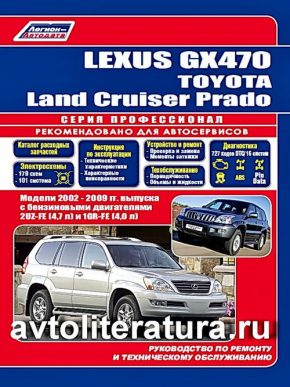 Руководство по ремонту Тойота Прадо 120, инструкция по эксплуатации Toyota Prado, техническое обслуживание, устройство и каталог расходных запчастей Тойота Прадо, 2002-2009 г. выпуска, оборудованных бензиновыми двигателями 2UZ-FE, 1GR-FE, рабочим объемом 4,7 и 4,0 л. Ремонт Ремонт Тойота  Прадо 120. Эксплуатация и техобслуживание. Каталог расходных запчастей. Устройство Toyota  Prado 120. Описание неисправностей. Схемы электрических соединений.