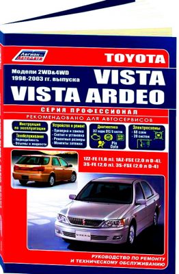 Справочное пособие в иллюстрациях Руководство по ремонту Toyota Vista / Toyota Vista Ardeo, а также руководство по эксплуатации и техническому обслуживанию, устройство автомобилей Toyota Vista, Vista Ardeo. Модели 2WD & 4WD, 1998-2002 гг. выпуска оборудованных бензиновыми двигателями 1ZZ-FE (1,8 л.), 3S-FE (2,0 л.) и 3S-FSE (2,0 л. D-4). Ремонт Тойота Виста Ардео. Диагностика. Инструкция по эксплуатации и ТО, Электросхемы.