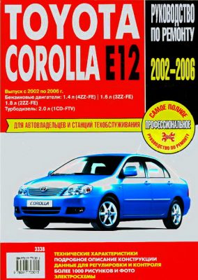Руководство по ремонту Тойота Королла Е12 2002-2006 г. выпуска, оборудованных бензиновыми двигателями рабочим объемом 1,3, 1,6, 1,8 литра, а также турбодизельными двигателями рабочим объемом 2,0 литра.