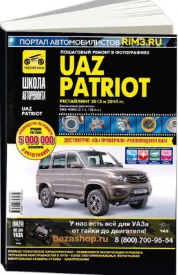 Книга по ремонту, руководство по ремонту УАЗ Патриот, инструкция по эксплуатации UAZ Patriot с 2012 г. выпуска, включая рестайлинговые модели с 2014 г. выпуска, оборудованных бензиновым двигателем ЗМЗ-40905 рабочим объемом 2,7 литра.