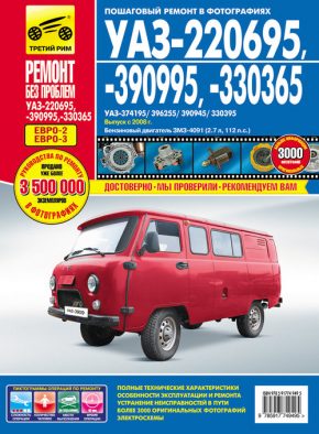 Иллюстрированное в цвете справочно-информационное издание руководство по ремонту УАЗ-3909 (УАЗ Фермер, УАЗ Буханка), УАЗ-2206, УАЗ-220695, УАЗ-390995, УАЗ-330365, УАЗ-452 и их модификаций, руководство по эксплуатации и техническому обслуживанию УАЗ-3909, УАЗ-220695, УАЗ-390995, УАЗ-330365, устройство УАЗ-3909, УАЗ-220695, УАЗ-390995, УАЗ-330365 с 2008 г. выпуска, оборудованных бензиновыми двигателями ЗМЗ-4091 рабочим объемом 2,7 л. (112 л.с.). Руководство включает в себя более 3000 оригинальных цветных фотографий, максимально и в подробностях отображающих весь процесс пошагового ремонта техники. Ремонт УАЗ 3909 (Фермер, Буханка). Цветные фотографии. Устройство. Эксплуатация. ТО. Схемы электрических соединений.
