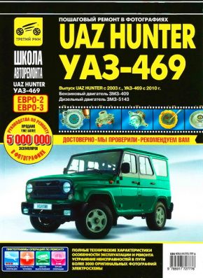 Книга по ремонту УАЗ Хантер. Руководство по ремонту и техобслуживанию, пособие по эксплуатации UAZ Hunter с 2003 г. выпуска, УАЗ-469 с 2010 г. выпуска, оборудованных бензиновыми двигателями ЗМЗ-409 и дизельными двигателями ЗМЗ-5143.