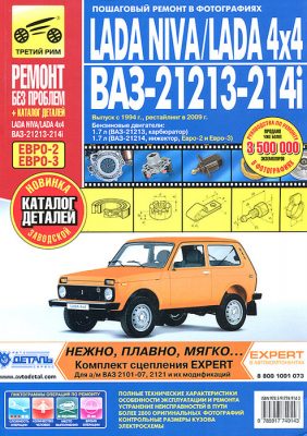 Цветное справочное издание Руководство по ремонту ВАЗ Лада Нива, а также руководство по техническому обслуживанию и эксплуатации, устройство автомобилей ВАЗ 21213, 21214i Нива + каталог запчастей ВАЗ 21213, 21214i Niva, оснащенных карбюраторными и инжекторными бензиновыми двигателями рабочим объемом 1,7 л. Ремонт узлов и агрегатов Лада Нива. Цветные фотографии. Устройство, эксплуатация, обслуживание, электрические схемы. Каталог деталей.