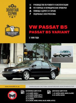 Книга по ремонту Фольксваген Пассат В5 / Пассат Б5 Вариант, а также инструкция по техническому обслуживанию и эксплуатации автомобилей VW Passat B5 / Passat B5 Variant с 1996 года выпуска. Данные модели оборудованы бензиновыми двигателями рабочим объемом 1,6 л. (ADP/AHL), 1,8 л. (ADR/AEB/AFY), 2,0 л. (ASU/AUZ/AVA), 2,3 л. (AGZ), 2,8 л. (ACK/AGE/AHA/ALG/AQD/ATX), а также дизельными двигателями рабочим объемом 1,9 л. (AFN/AHH/AHU/AJM), 2,5 л. (AFB/AKN). Ремонт Фольксваген Пассат В5. Эксплуатация, устройство, помощь в дороге и гараже. Схемы электрооборудования.