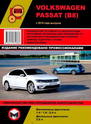 Руководство по ремонту Volkswagen Passat В8, книга по техническому обслуживанию, инструкция по эксплуатации Фольксваген Пассат Б8 с 2015 г. выпуска, оборудованных бензиновыми двигателями рабочим объемом 1,4, 1,8, 2,0 литра и дизельными двигателями рабочим объемом 2,0 литра. Ремонт Фольксваген Пассат В8. Инструкция по эксплуатации. Схемы электрооборудования. Помощь в дороге и гараже. Система определения неисправностей.