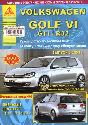 Справочно-информационное подробнейшее пособие книга по ремонту Volkswagen Golf 6 / Volkswagen Golf GTI / Volkswagen Golf R32, а также руководство по эксплуатации и техническому обслуживанию Volkswagen Golf 6, устройство автомобилей Volkswagen Golf 6 с 2008 г. выпуска, включая модели с полным приводом, оборудованных бензиновыми силовыми агрегатами рабочим объемом 1,2, 1,4, 1,6, 1,8, 2,0 л.