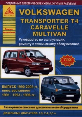 Подробнейшее справочно-информационное пособие руководство по ремонту и обслуживанию Фольксваген Мультивен, Фольксваген Транспортер Т4, Фольксваген Каравелла, эксплуатация и устройство Фольксваген Мультивен, Фольксваген Транспортер Т4, Фольксваген Каравелла, с 1990 по 2003 гг. выпуска, (включая рестайлинг 1991, 1993 и 1996 годов). Модели оборудовались дизельными моторами рабочим объемом 1,9, 2,4 и 2,5 л.