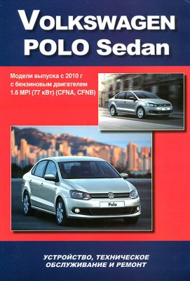 Справочное иллюстрированное издание книга по ремонту Volkswagen Polo Sedan, устройство Volkswagen Polo Sedan, руководство по эксплуатации и техобслуживанию Volkswagen Polo Sedan, которые выпускаются концерном Volkswagen AG с 2010 года и оснащаются модели бензиновыми силовыми агрегатами CFNA, CFNB литражом 1,6 (77 кВт).