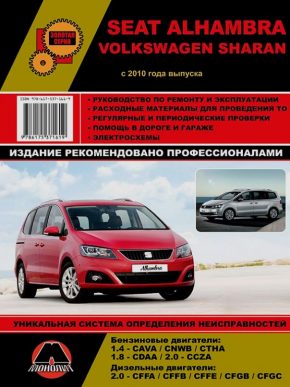 Иллюстрированная книга по ремонту VW Sharan / Seat Alhambra, пособие по техническому обслуживанию и эксплуатации автомобилей Фольксваген Шаран / Сеат Алхамбра с 2010 года выпуска. Модели оснащены бензиновыми двигателями CAVA / CNWB / СTHA – 1,4 л., CDAA – 1,8 л., CCZA – 2,0 л., а также дизельными двигателями CFFA / CFFB / CFFE / СFGB / CFGC – 2,0 л.