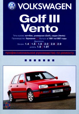 Справочное иллюстрированное издание Книга по ремонту Volkswagen Vento / Golf III, устройство, руководство по техобслуживанию и эксплуатации Volkswagen Golf 3-го поколения (тип 1Н) в кузове хэтчбек и универсал и VW Vento (тип 1Н2) в кузове седан, которые выпускались в Вольфсбурге (Германия) с 1991 по 1997 годы, оборудованных бензиновыми двигателями литражом 1,4, 1,6, 1,8, 2,0, 2,8, 2,9, а также дизелями литражом 1,9. На машины установлены 5-ти ступенчатая МКП либо 4-х ступенчатый автомат.